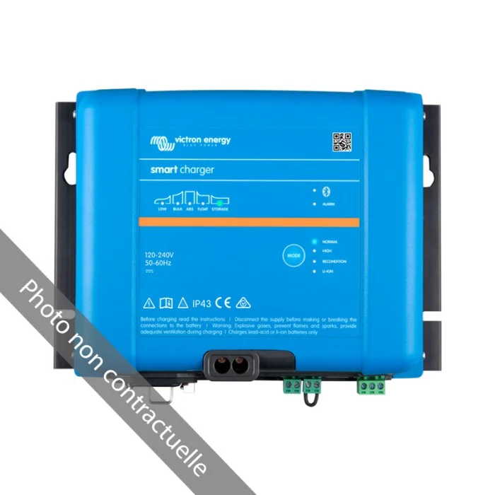 Rarement un chargeur aura autant de cordes à son arc. Le Smart IP43 48/13 accepte indifféremment les batteries au plomb, AGM, GEL et lithium-ion LiFePO4, avec pour ces dernières un profil de charge à 3 étapes aux tensions calibrées (Absorption : 56,8 V, Stockage : 54 V). La compensation de température automatique, réglée par défaut à −64 mV/°C, adapte en permanence les seuils de charge aux variations thermiques de l'environnement. La tension de sortie étant entièrement programmable via Bluetooth ou VE.Direct, l'appareil peut également être exploité comme alimentation CC régulée dans certaines configurations, offrant ainsi une double utilité. Un relais programmable (SPDT, 5 A jusqu'à 250 VCA) autorise l'automatisation d'alarmes ou d'événements externes, tandis que l'interrupteur On/Off à distance simplifie l'intégration dans des tableaux de commande. Un seul produit, un champ des possibles remarquablement étendu.