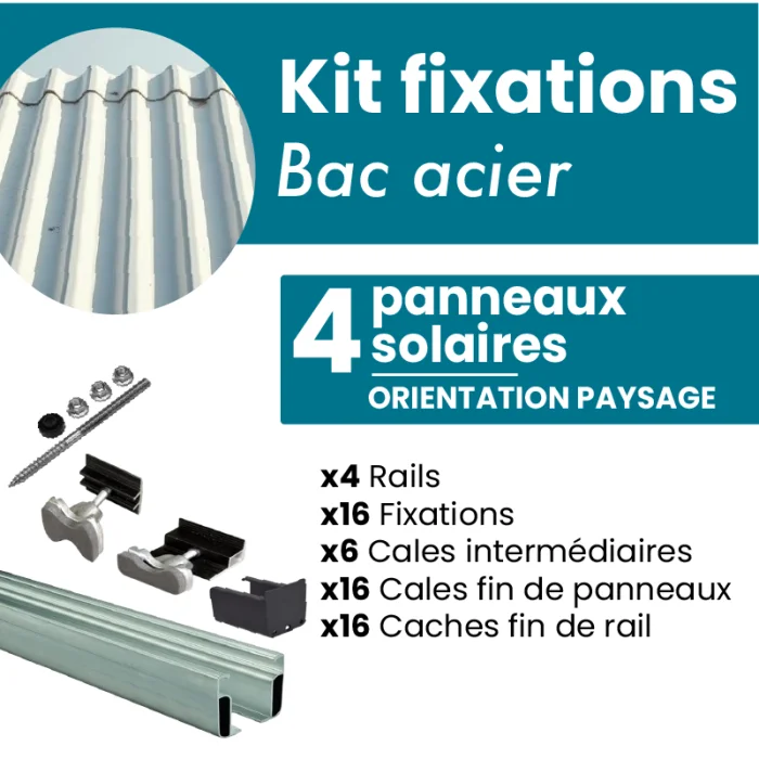 Kit de fixation NOIR ou GRIS pour 4 panneaux solaires sur Toiture bac acier, toit en tôle - PAYSAGE
