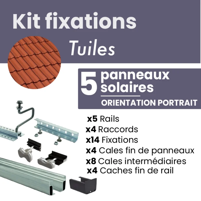 Ce kit a spécialement été conçu pour fixer jusqu'à 5 panneaux solaires sur des tuiles mécaniques. Il permettra une attache sûre et solide de vos panneaux sur votre toit.