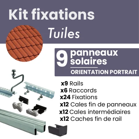 Ce kit a spécialement été conçu pour fixer jusqu'à 9 panneaux solaires sur des tuiles mécaniques. Il permettra une attache sûre et solide de vos panneaux sur votre toit.